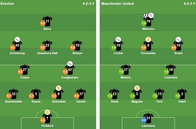 Tuy nhiên, đội bóng của David Moyes cũng cho thấy sự lỳ lợm đáng khen ngợi khi dần lấy lại thế trận ở những phút cuối hiệp một. Cơ hội ngon ăn nhất của họ thuộc về James Garner với một cú sút phạt hàng rào kỹ thuật, nhưng thủ thành Senne Lammens bên phía Man Utd đã chơi cảnh giác và bắt gọn bóng.