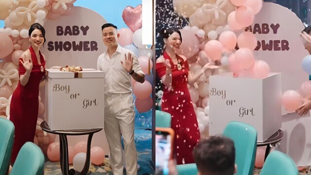 Khoảnh khắc được nhiều người chú ý nhất là khi hai vợ chồng cùng mở chiếc thùng bí mật đặt giữa buổi tiệc. Ngay sau đó, những chùm bóng bay màu hồng bay lên, chính thức hé lộ em bé tuổi Ngọ mà Bích Thủy đang mang thai là một bé gái.