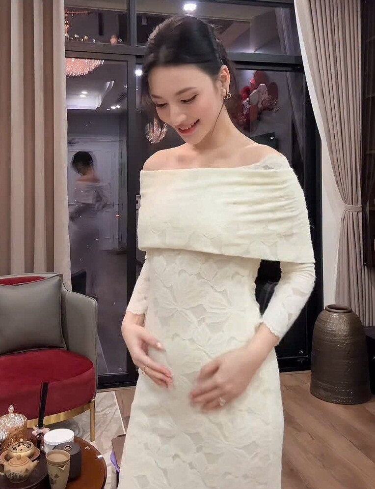 Trong buổi tiệc, nữ diễn viên diện chiếc đầm đỏ nổi bật ôm sát cơ thể, khoe khéo đường cong của mẹ bầu. Dù vòng hai đã nhô lên khá rõ, tay chân của cô vẫn thon gọn, gương mặt rạng rỡ khiến nhiều người khen ngợi “mẹ bỉm xinh xuất sắc”.