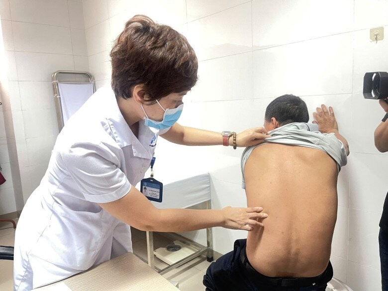 Bác sĩ Phương Dung đang thăm khám da liễu cho một nam bệnh nhân.