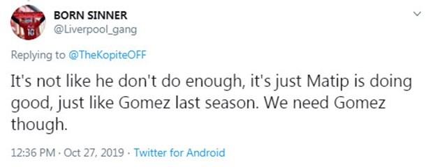 "Không phải Gomez không đủ giỏi, mà đơn giản Matip đang làm quá tốt như cách Gomez thể hiện mùa trước. Tôi cho rằng chúng ta vẫn cần Gomez."