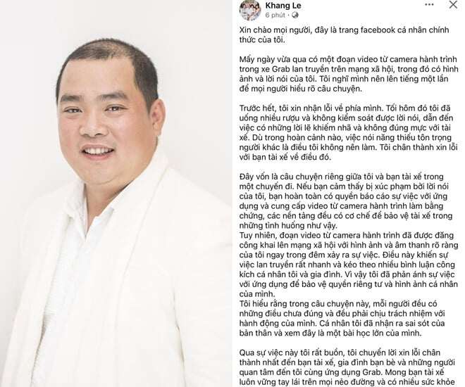 Minh Khang cũng gửi lời xin lỗi trực tiếp đến nam tài xế vì những xúc phạm về mặt ngôn từ đã gây ra trong chuyến đi: "Tôi nghĩ mình nên lên tiếng một lần để mọi người hiểu rõ câu chuyện. Trước hết, tôi xin nhận lỗi về phía mình. Tối hôm đó tôi đã uống nhiều rượu và không kiểm soát được lời nói, dẫn đến việc có những lời lẽ khiếm nhã và không đúng mực với tài xế. Dù trong hoàn cảnh nào, việc nói năng thiếu tôn trọng người khác là điều tôi không nên làm. Tôi chân thành xin lỗi với bạn tài xế về điều đó".