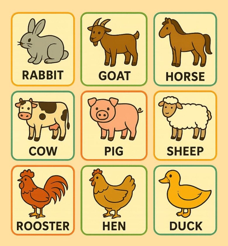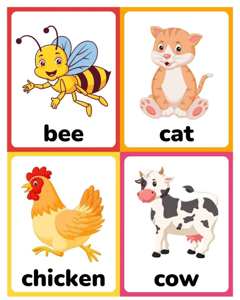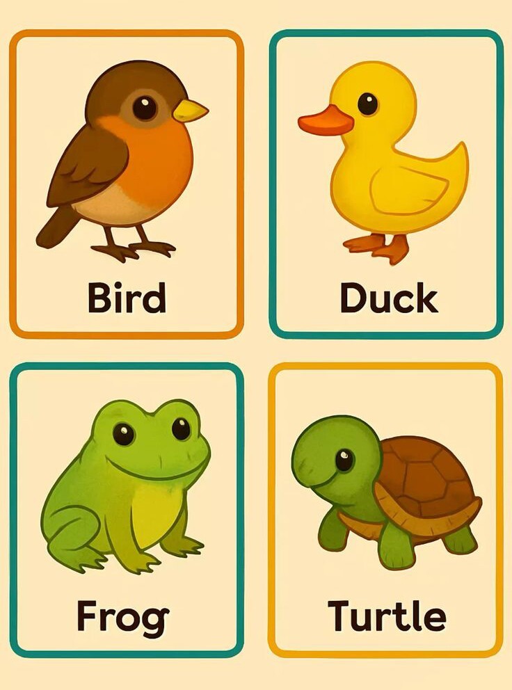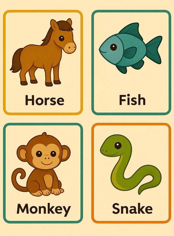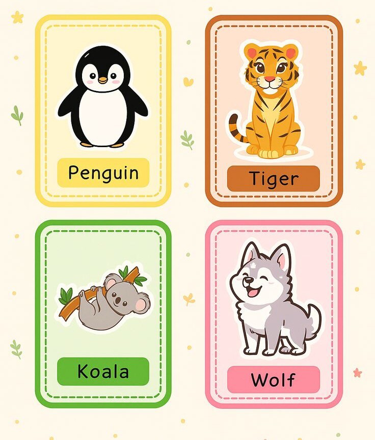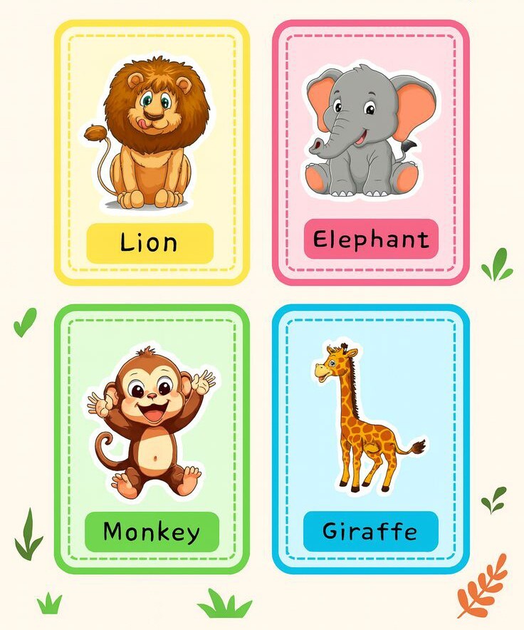 Trẻ nhỏ thường rất tò mò về các loài vật. Những hình ảnh quen thuộc như chó, mèo, gà, vịt hay những con vật thú vị như sư tử, voi, hươu cao cổ luôn dễ dàng thu hút sự chú ý của trẻ. Khi được thể hiện dưới dạng flashcard với màu sắc tươi sáng, hình vẽ rõ ràng và thân thiện, các loài động vật trở nên gần gũi và dễ ghi nhớ hơn.