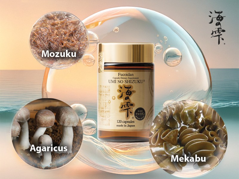 Thực phẩm bảo vệ sức khỏe Fucoidan Umi No Shizuku dạng nước, với sự kết hợp từ fucoidan chiết xuất tảo nâu Mozuku, tảo nâu Mekabu và bột tinh chế từ nấm Agaricus. Ảnh: Công ty Umi No Shizuku