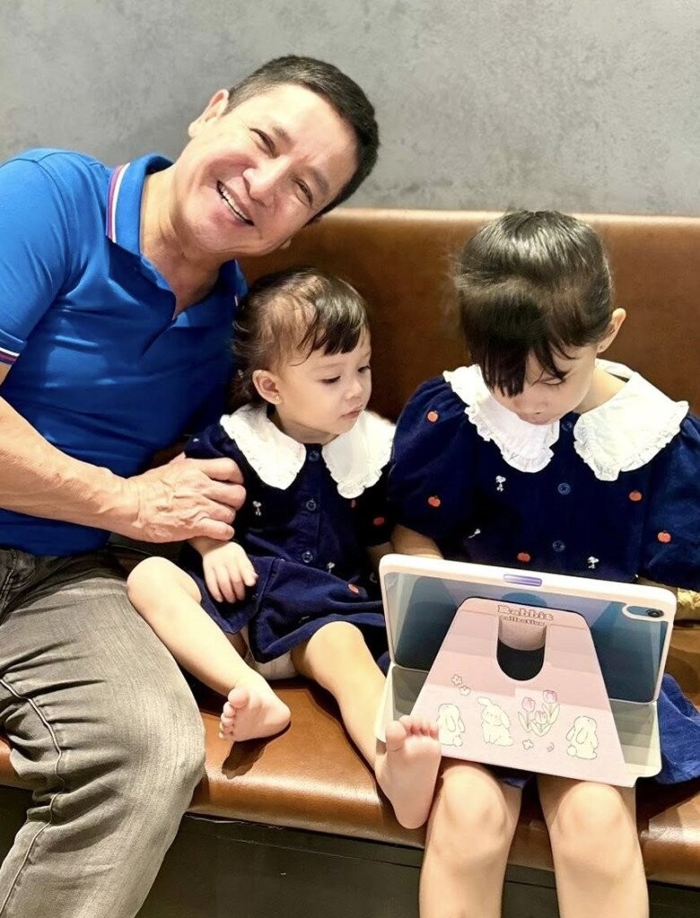 Nam nghệ sĩ đưa 2 cháu nội đi ra quán cà phê để uống nước, chơi đùa.