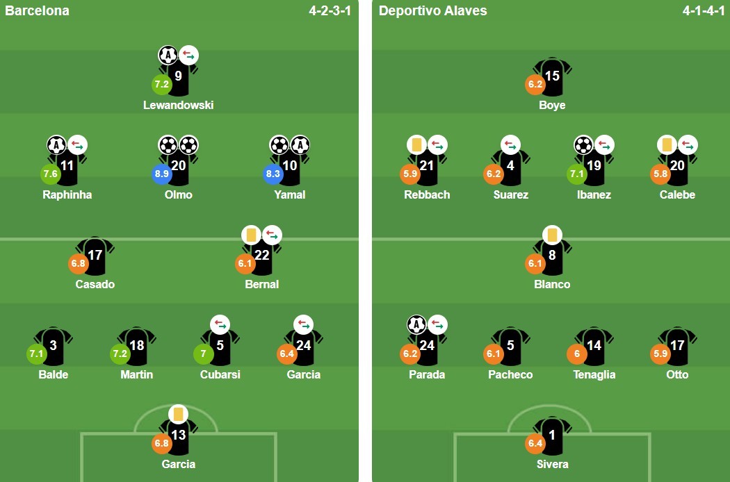 Sau bàn gỡ, Barcelona gia tăng sức ép. Raphinha, Dani Olmo và Yamal liên tục tung ra các cú sút nguy hiểm nhưng đều bị hệ thống phòng ngự kiên cường của Alaves chặn lại. Riêng thủ thành Joan Garcia có ít nhất hai pha cứu thua xuất sắc để giữ tỉ số. Phút 26, Raphinha chuyền tinh tế để Dani Olmo dứt điểm vào góc xa, nâng tỉ số lên 2-1 cho Barcelona. Đó là pha bóng cho thấy chất lượng kỹ thuật của hàng tiền vệ đội chủ nhà, khi họ tận dụng sự chậm trễ trong phòng ngự của Alaves.