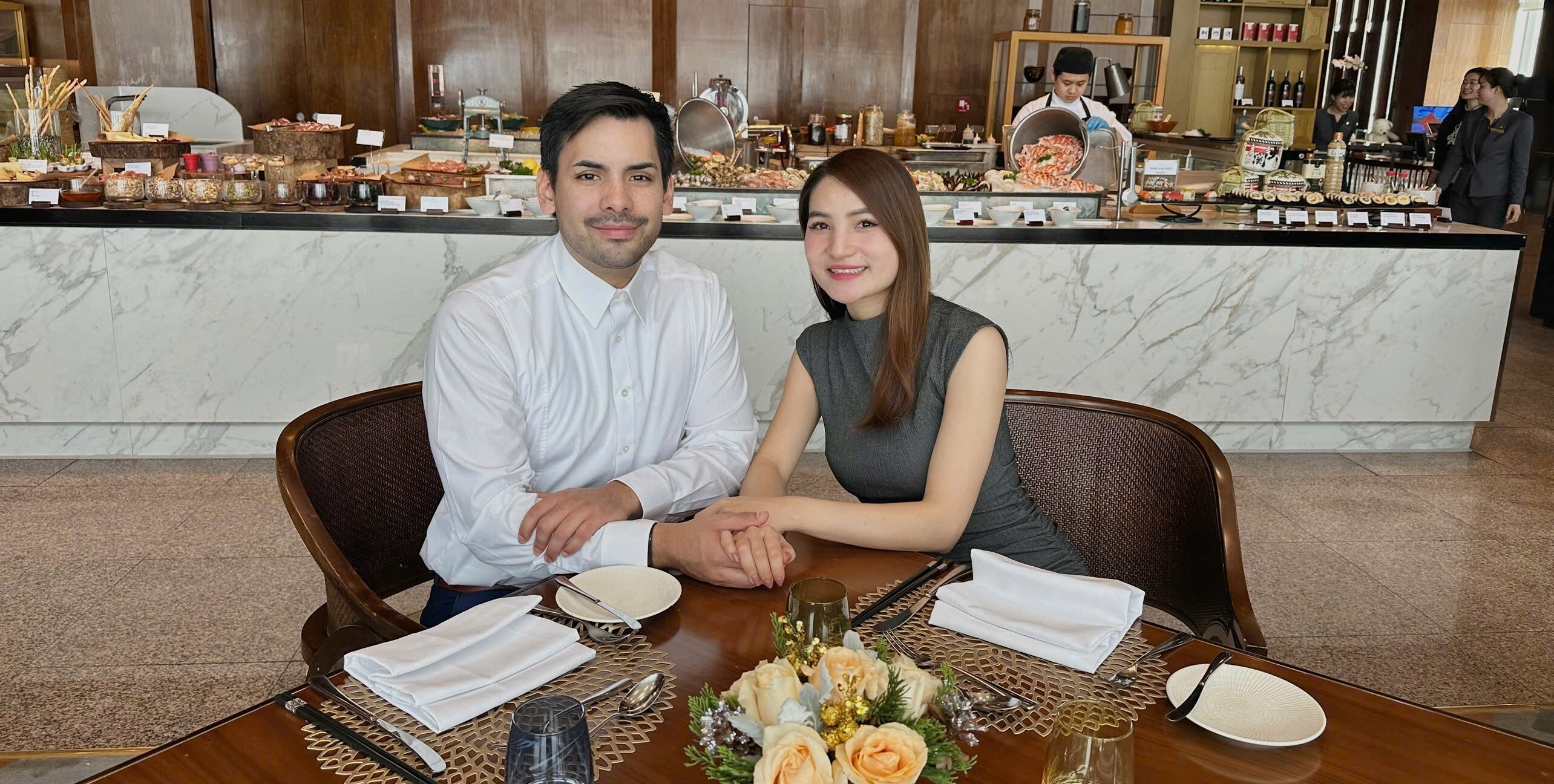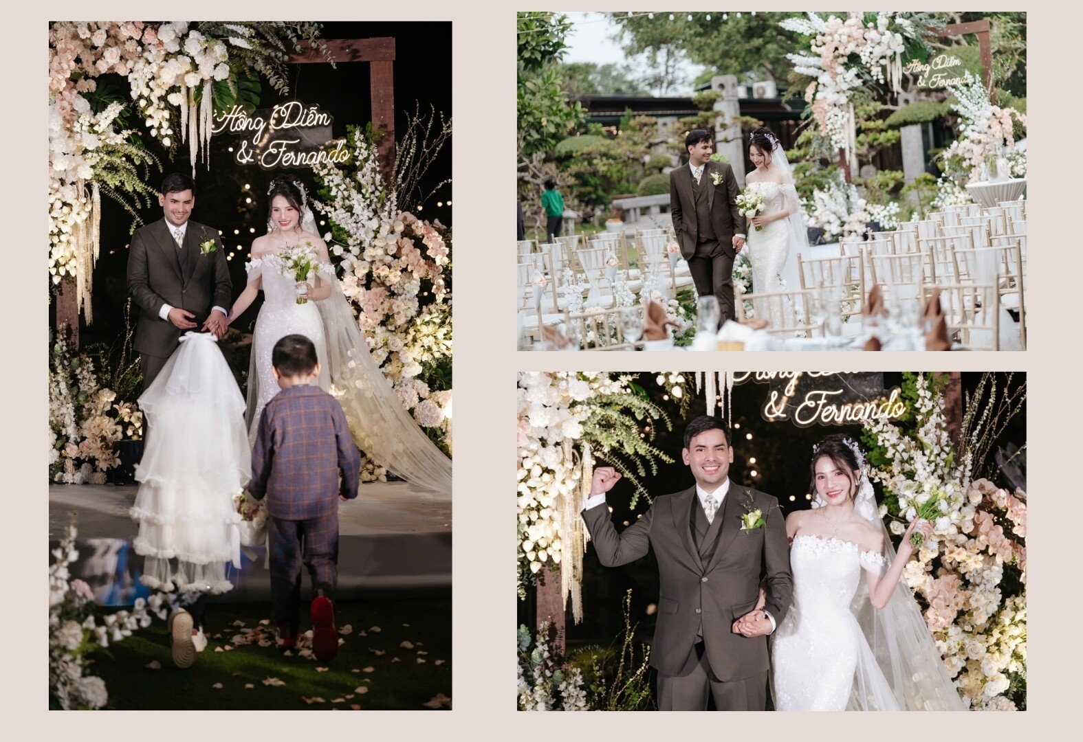 “Nhà anh trao 7 tráp, một số người bạn của anh từ Đức sang dự và đã mặc áo dài làm phù rể. Về vàng cưới, mẹ chồng chủ động hỏi ý kiến tôi, và sau khi được gợi ý khoảng 5 chỉ, mẹ đã chuẩn bị đầy đủ”, Hồng Diễm chia sẻ. Đáng nói, đám cưới được tổ chức ngay tại nhà hàng nơi hai người gặp nhau lần đầu.