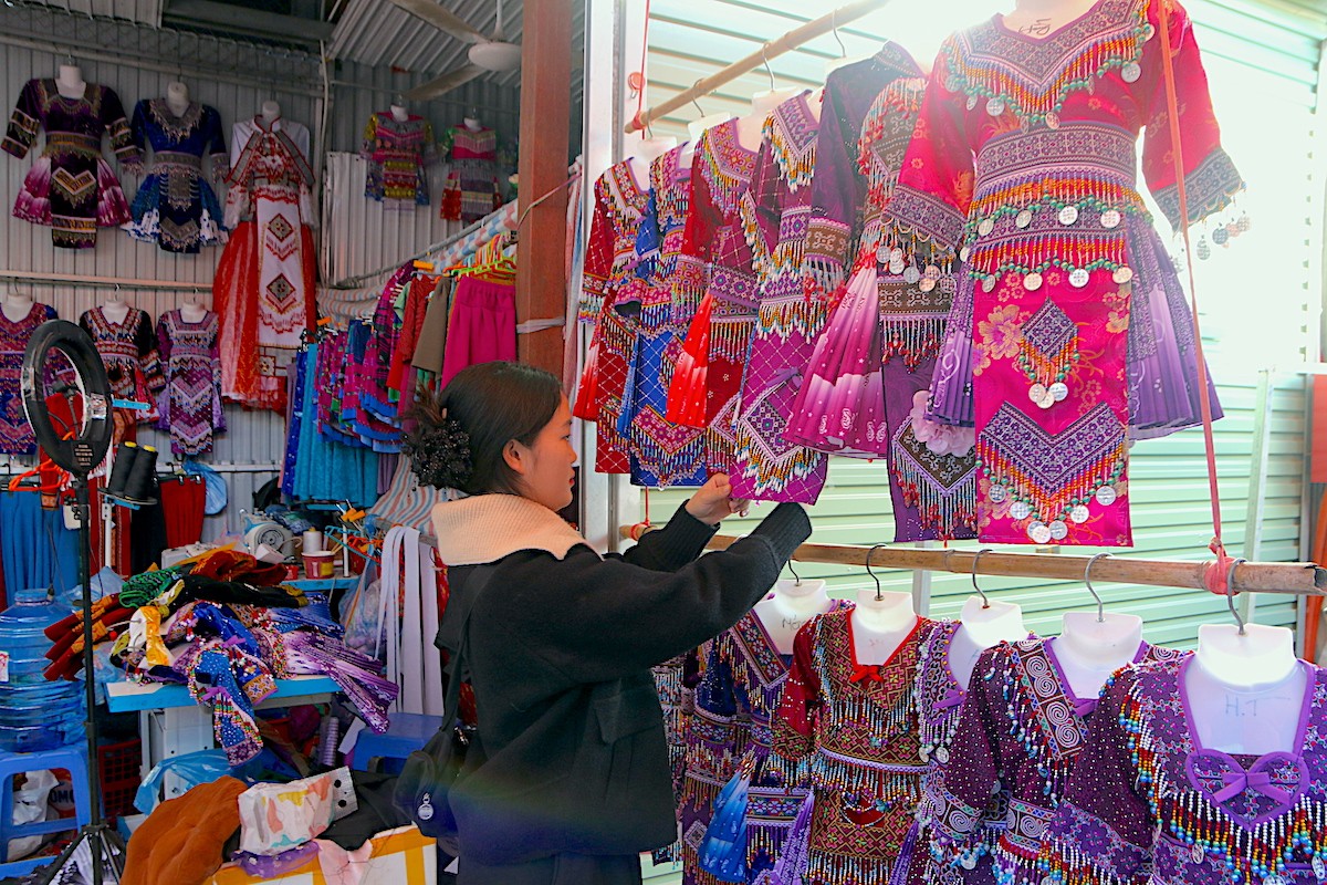 Nét đặc trưng ở chợ phiên Mường Khương là vải thổ cẩm, quần áo, váy thổ cẩm ở đây được bày bán phong phú về chủng loại màu sắc. Những bộ đồ, áo đầm xòe, túi vải… màu tím chàm, xanh, đỏ rực rỡ cùng vô số món đồ trang sức.