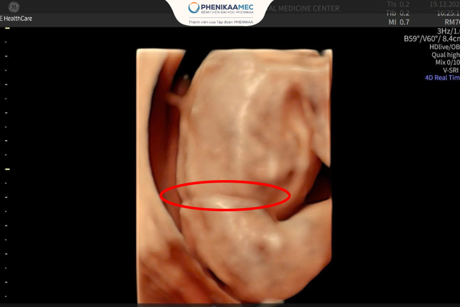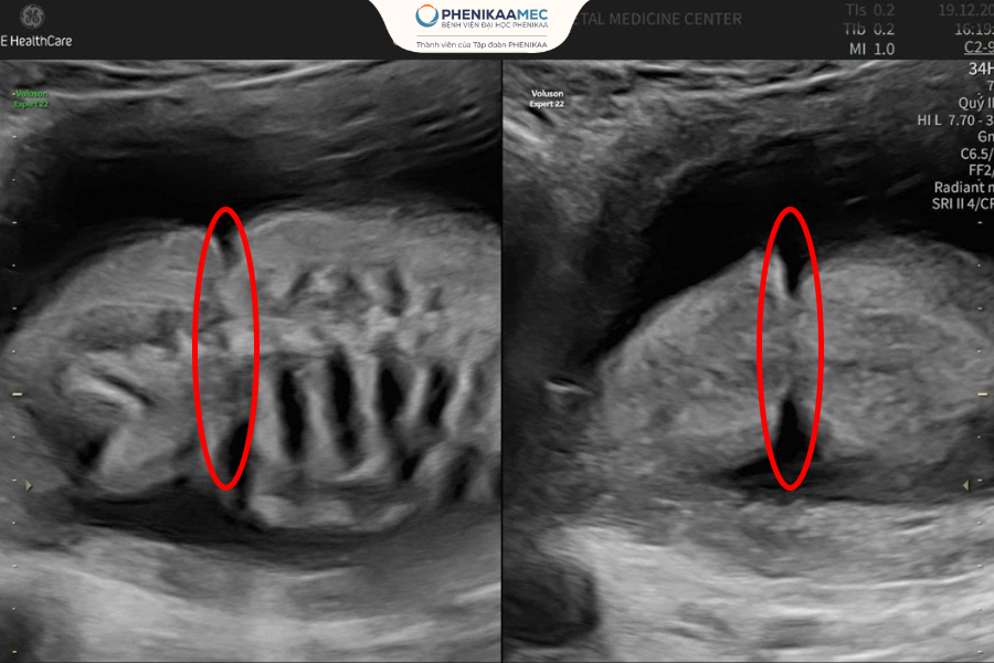 Hình ảnh siêu âm cho thấy dải xơ buồng ối thắt ngang bụng của thai nhi