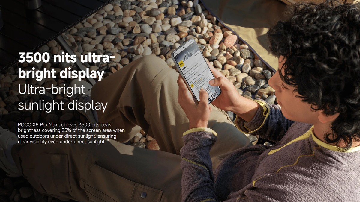 Màn hình AMOLED 1.5K trên POCO X8 Pro mang lại trải nghiệm thị giác sắc nét, đáp ứng trọn vẹn từ xử lý công việc đến giải trí đỉnh cao. Với độ sáng kỷ lục 3500 nits, thiết bị cho phép bạn kiểm tra dữ liệu hay đọc tài liệu ngoài trời một cách dễ dàng, xóa tan nỗi lo chói gắt dưới ánh nắng mạnh.