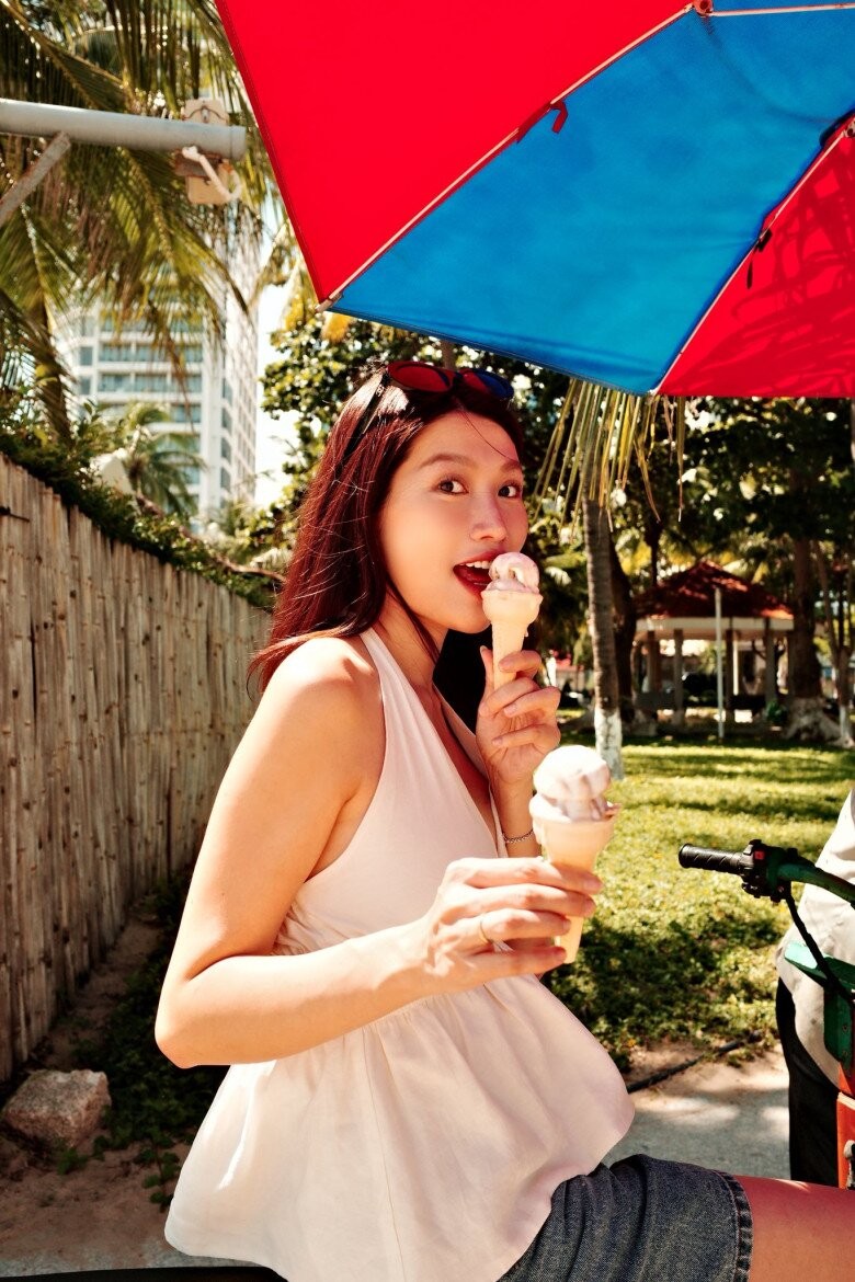 Mẹ bầu Chế Nguyễn Quỳnh Châu khoe sắc vóc thon gọn khi đi ăn kem. Ở những tháng cuối thai kỳ, cô được nhận xét giữ vóc dáng thon gọn, vẻ ngoài rạng rỡ dù bụng bầu lớn.