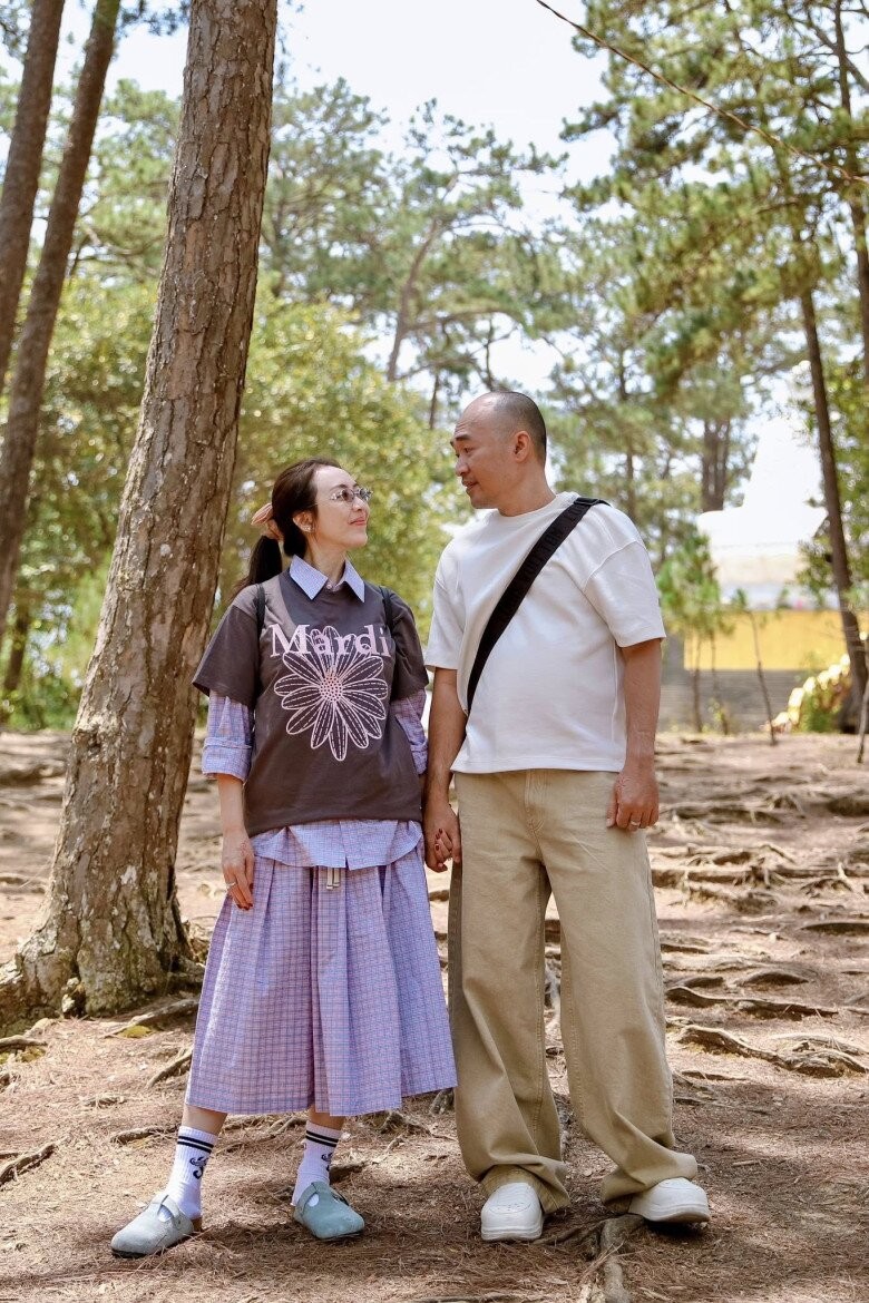 Vợ chồng Thu Trang - Tiến Luật diện đồ trẻ trung, nắm tay nhau dạo chơi tại Đà Lạt, đồng thời hài hước viết: "Đi Đà Lạt chủ yếu để đổi chỗ chill thôi mấy em, chứ tour tận 1 triệu rưỡi, chị lên lịch trình như vầy là ok rồi."
