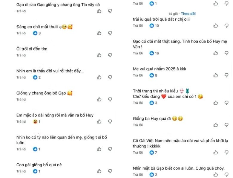 Bên dưới bài đăng, cư dân mạng để lại hàng loạt bình luận xuýt xoa. Nhiều người nhận xét cô bé sở hữu nét đáng yêu “đốn tim”, đặc biệt là ánh mắt sáng và gương mặt bụ bẫm. Không ít ý kiến còn hài hước cho rằng nhóc tì “giống ba như đúc”, trong khi số khác lại khen ngợi phong cách chăm con cực “chịu chi” của nữ diễn viên.