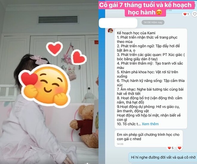 Mới đây trên trang cá nhân, nữ MC đăng tải đoạn tin nhắn với bảo mẫu, hé lộ “thời khóa biểu” của con gái mới 7 tháng tuổi. Cô hài hước gọi vui: “Cô gái 7 tháng tuổi và kế hoạch học hành vất vả”.