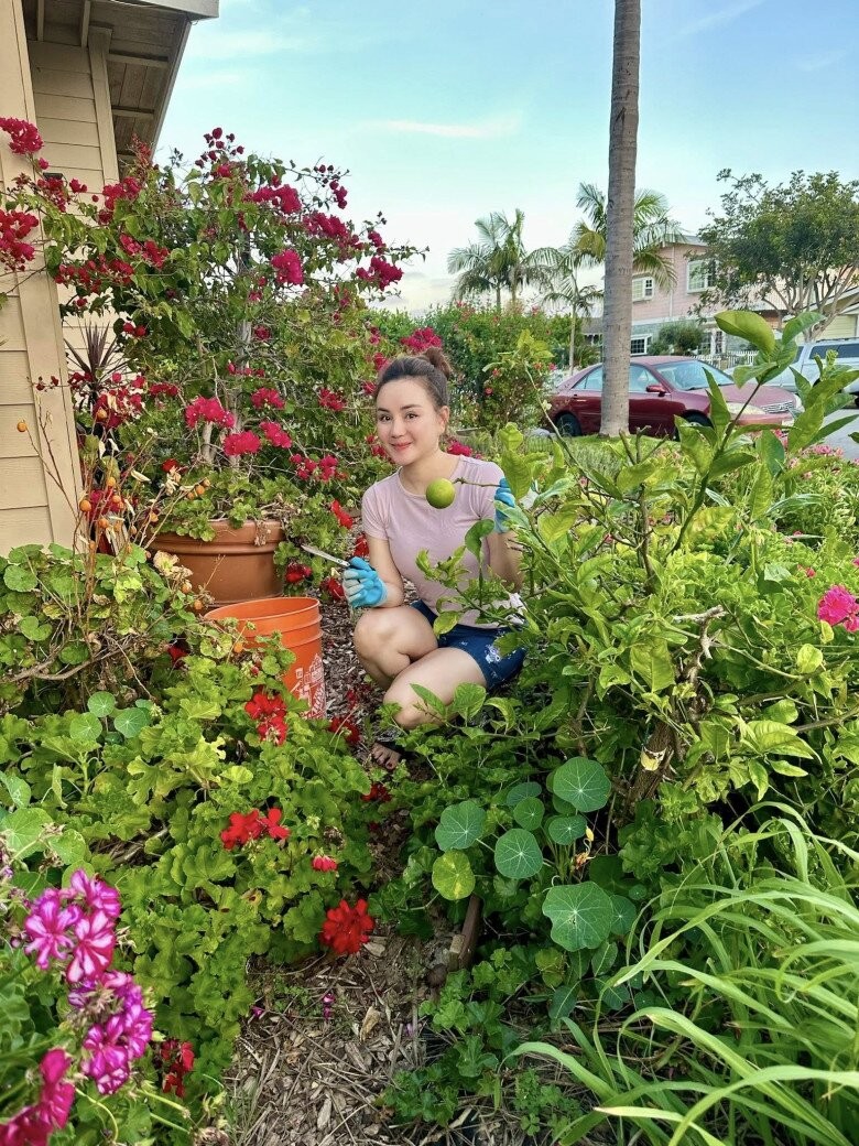 Ca sĩ Vy Oanh chia sẻ cuộc sống bình yên khi chăm sóc vườn hoa quả sai trĩu bên trời Tây và chia sẻ: "Mấy hôm nắng quá, mấy em hơi tơi tã, chăm lại chút chắc sẽ xinh hơn. Nhà bên có cái cây gì lạ quá, có hoa mà trụi trơn lá, là cây gì nhỉ?".