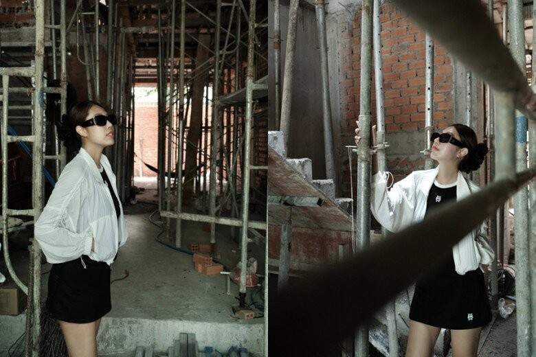 Vợ trẻ Quang Minh cũng chụp một bộ ảnh tại ngôi nhà đang xây dựng.
