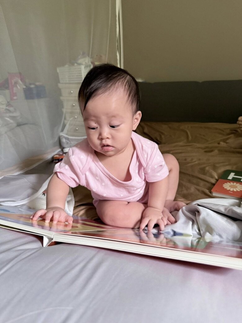 Con gái Quỳnh Lương gây chú ý với biểu cảm ngơ ngác khi xem sách tranh. Nữ diễn viên hài hước viết: "Sáng ra mới ăn bát cháo chưa kịp tiêu đã phải học bài rồi".