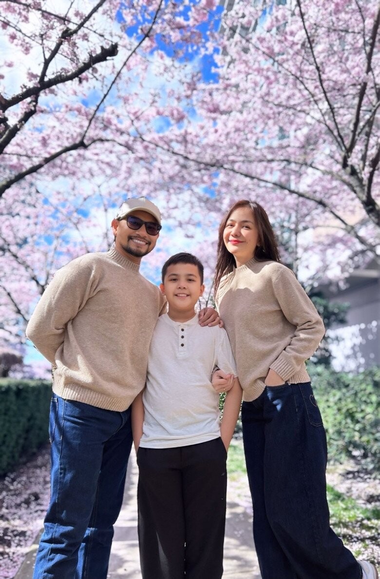 Vợ chồng Huỳnh Đông và Ái Châu dẫn cậu con trai Happy ngắm hoa anh đào nở rộ. Cô chia sẻ: "Hoa đào bắt đầu nở rồi, tụi mình cũng dẫn nhau đi chụp thôi. mùa này đẹp nao lòng luôn!".