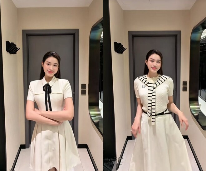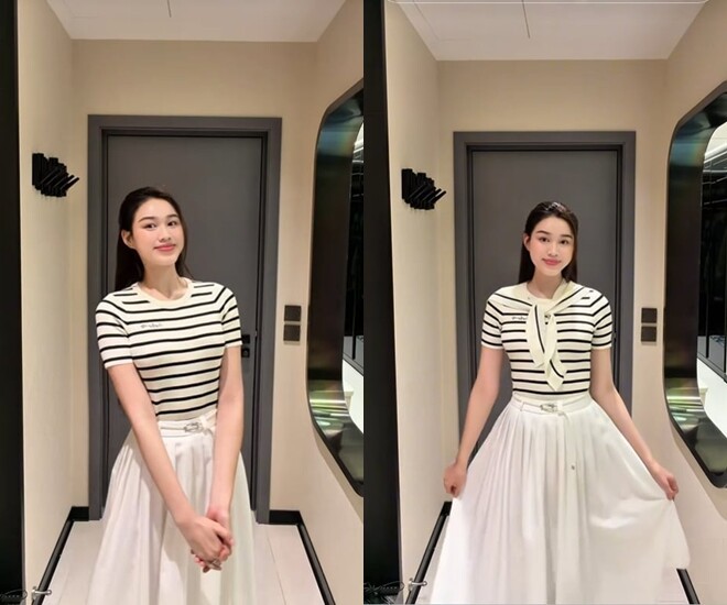 Trong loạt ảnh, Đỗ Hà khéo léo lựa chọn những outfit tối giản nhưng tinh tế, từ váy xòe nữ tính đến áo thun kẻ phối chân váy dài, tất cả đều tôn lên vóc dáng thanh mảnh cùng thần thái nhẹ nhàng, chuẩn “nàng dâu hào môn”.