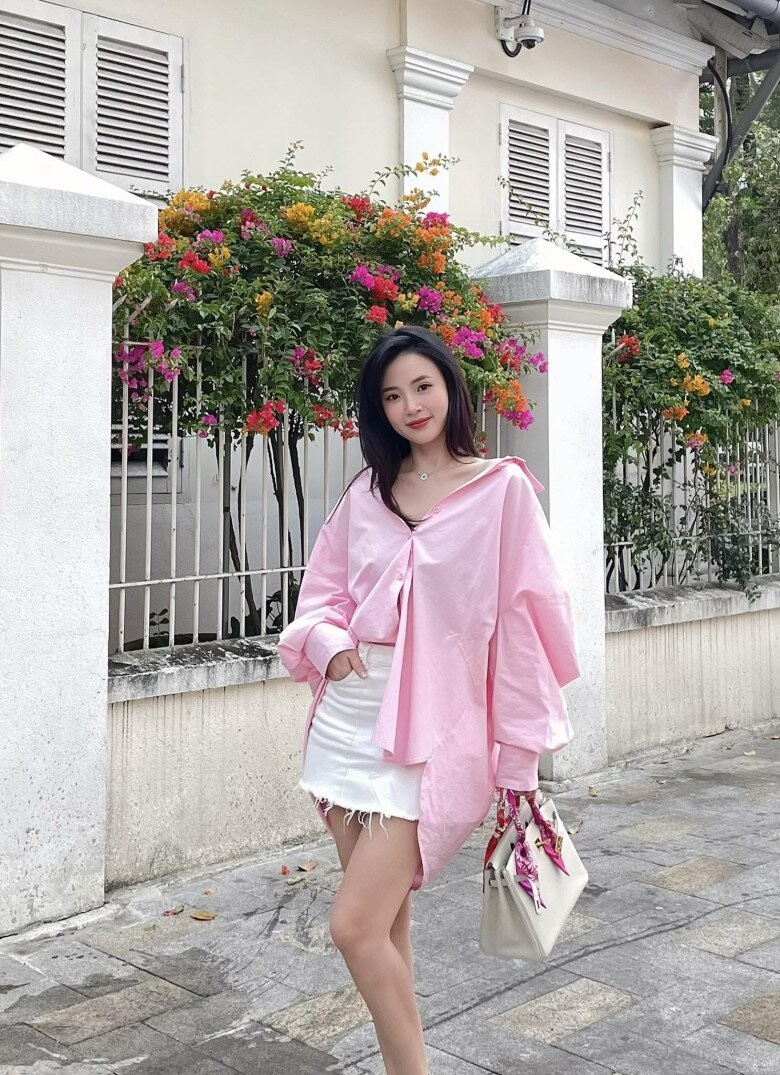 “Dâu hào môn” Midu gây chú ý với phong cách trẻ trung pha chút ngọt ngào khi diện áo sơ mi hồng cùng chân váy bò ngắn, đồng thời chia sẻ: "Đủ nắng hoa sẽ nở. Đời không cần rực rỡ. Chỉ cần thật bình an".