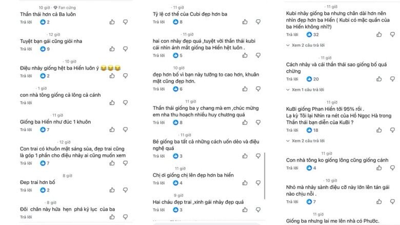 Một số bình luận nhận xét như: “Kubi nhảy giống ba nhưng chân dài hơn nên nhìn đẹp hơn ba Hiển”, “Đẹp hơn bố vì bạn này tướng to cao hơn, khuôn mặt cũng đẹp hơn”, “Con trai có khuôn mặt sáng sủa, đẹp trai cũng là góp phần cho điệu nhảy này ai cũng muốn xem”, “Đôi chân này hứa hẹn phá kỷ lục của ba”, “Thần thái hơn cả ba luôn”, “Điệu nhảy giống hệt ba Hiển luôn”, "Kubi giống ba Phan Hiển tới 95% rồi”, “Con nhà tông giống cả lông cả cánh”, “Bé giống ba tất cả những cách uốn dẻo và điệu nghệ quá”, “Cách nhảy và cái thần thái sao giống bố quá chừng”,....