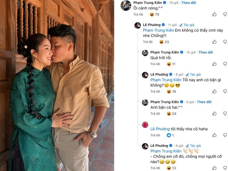 Không lâu sau đó, ông xã của nữ diễn viên - ca sĩ Phạm Trung Kiên - cũng vào bình luận khiến nhiều người thích thú: “Ôi cảnh nóng”. Thấy vậy, Lê Phương lập tức “chữa cháy” đầy hài hước: “Em không có thấy comment này nhe chồng!!!”.