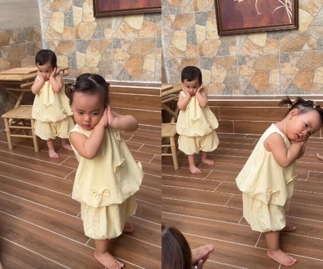 Trong đoạn clip, 2 bé diện đồ đôi tông vàng nhạt, ngồi đối diện và nắm tay nhau chơi đùa cực kỳ đáng yêu. Không chỉ gây sốt bởi biểu cảm ngộ nghĩnh, nhiều người còn nhận ra 2 nhóc tì chính là "bản sao" của Tiến Luật và Thu Trang. Một bé có đường nét gương mặt, thần thái tinh nghịch khá giống nam diễn viên. Cô bé khá bụ bẫm và lém lỉnh khi chơi. Trong khi bé còn lại lại mang nhiều nét dịu dàng, bẽn lẽn và gương mặt với nhiều đường nét giống Thu Trang. Chính sự đối lập thú vị này khiến dân mạng thích thú, gọi vui đây là 2 phiên bản mini chuẩn chỉnh của cặp đôi đình đám.