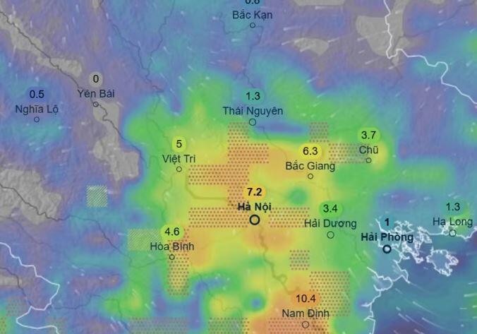 Nhiệt độ ở một số khu vực tại miền Bắc chiều nay, 17/4: Nhiệt độ Hà Nội giảm mạnh. Ảnh: Zoom Earth, OpenStreetMap, ICON.