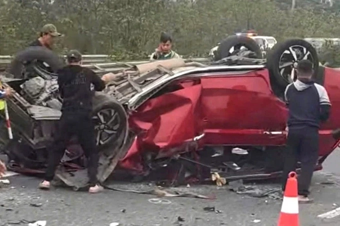 Ôtô 7 chỗ lật ngửa, biến dạng sau va chạm trên cao tốc