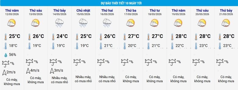 Từ ngày 12-16/3, thời tiết khu vực Bắc Bộ phổ biến ít mưa, sáng có sương mù nhẹ, ngày trời tạnh ráo, đêm và sáng trời rét, riêng khu vực Tây Bắc ngày 12/3 có mưa rào rải rác và có nơi có giông; từ đêm 14-16/3, khu vực vùng núi có mưa, mưa rào rải rác và có nơi có giông. Vùng đồng bằng, ven biển phía Đông của Bắc Bộ trong ngày 15/3, có khả năng có mưa nhỏ, mưa phùn và sương mù.