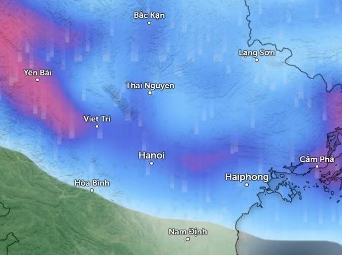 Dự báo mưa diện rộng ở miền Bắc đêm 16/4, sáng 17/4 (Những vùng màu xanh da trời là mưa nhỏ đến vừa, màu đỏ là mưa vừa đến mưa to). Ảnh: Zoom Earth, OpenStreetMap, ICON.