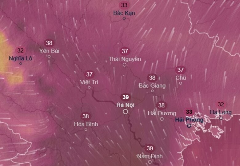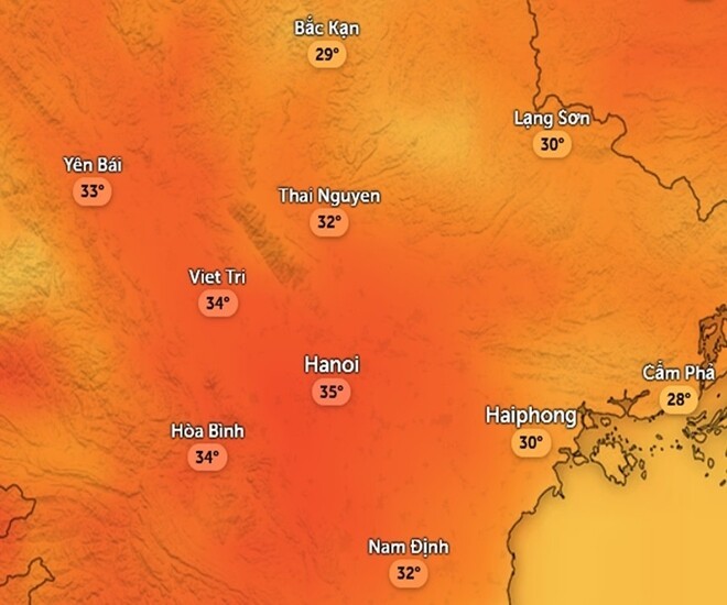Dự báo nhiệt độ cảm nhận ở một số khu vực tại miền Bắc chiều mai, 26/3: Hà Nội lên đến 35oC. Ảnh: Zoom Earth, OpenStreetMap, ICON.