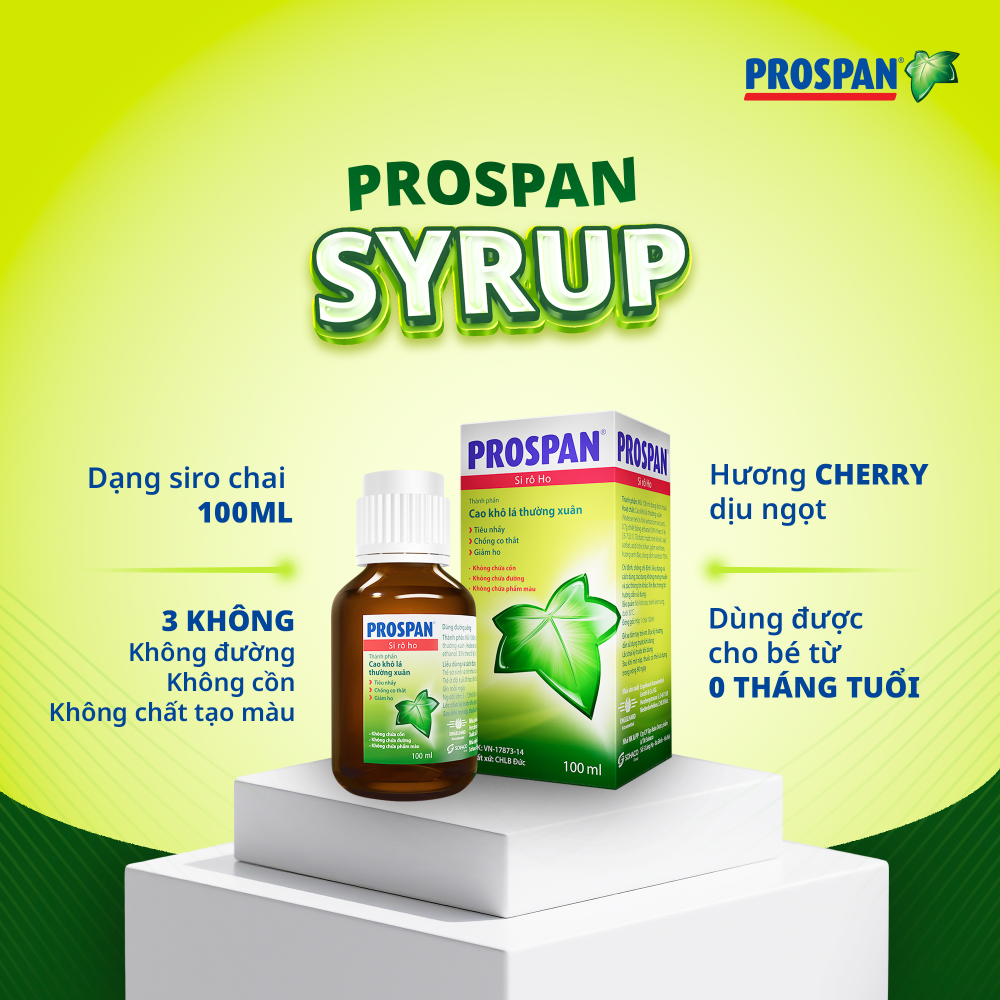 Prospan - Thuốc ho thảo dược, an toàn cho cả trẻ sơ sinh Prospan® là thuốc ho thảo dược của hãng dược phẩm Engelhard Arzneimittel (CHLB Đức) với thành phần chính là lá Thường xuân chiết xuất theo quy trình đặc biệt được đăng ký bản quyền tại Cơ quan Sáng chế Châu Âu (EPO) và Tổ chức Sở hữu Trí tuệ Thế giới (WIPO). Dịch chiết lá thường xuân trong Prospan® có tác dụng hoá lỏng chất đờm do quá trình viêm tạo ra, đồng thời chống co thắt phế quản, từ đó giúp giảm ho mà không làm mất phản xạ ho tự nhiên của cơ thể. Thuốc ho Prospan có 3 dạng bào chế, phù hợp với nhu cầu của từng thành viên trong gia đình: - Prospan Syrup: Dạng siro, an toàn cho trẻ từ 0 tháng tuổi trở lên. - Prospan Forte: Dạng siro hương bạc hà, cho trẻ từ 6 tuổi và người lớn. - Prospan Lozenges: Dạng viên ngậm mềm, không gây rát lưỡi, cho trẻ từ 6 tuổi và người lớn. Thuốc ho Prospan không cồn, không đường, không chất tạo màu, phù hợp cả với người tiểu đường, ăn kiêng. Prospan được nhập khẩu nguyên hộp từ CHLB Đức và phân phối chính thức tại Việt Nam bởi Tập đoàn Dược phẩm Sohaco. Sản phẩm có bán tại các nhà thuốc và hiệu thuốc trên toàn quốc. Tìm điểm bán Prospan gần nhất tại: https://prospan.com.vn/diem-ban |