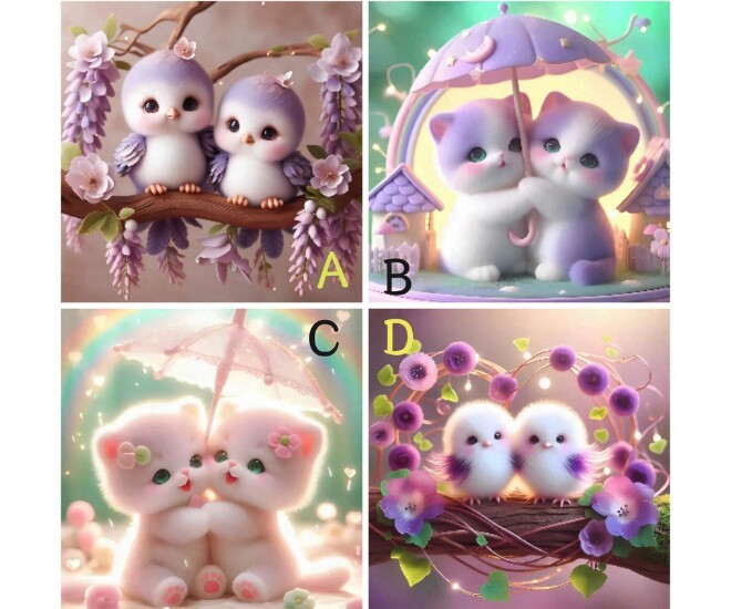Bạn chọn chú mèo nép mình dưới chiếc ô tím mộng mơ, gần nhau như đang bảo vệ một thế giới nhỏ. Tình yêu của các bạn mang cảm giác che chở, dù bên ngoài có bao nhiêu bão giông, các bạn vẫn bảo vệ nhau.