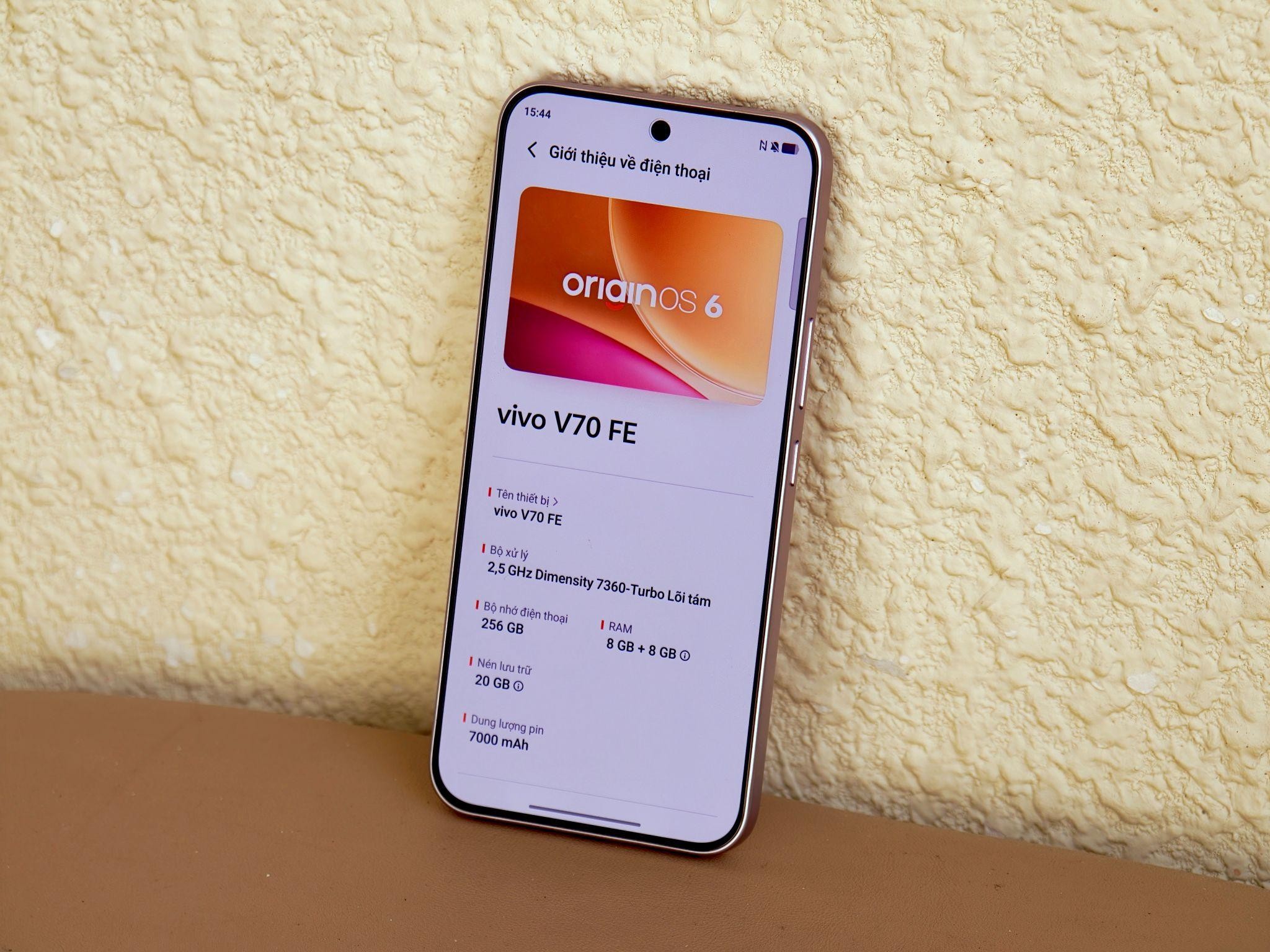 Về cấu hình, vivo V70 FE được trang bị chip MediaTek Dimensity 7360-Turbo 8 nhân, RAM 8 GB và bộ nhớ trong 256 GB.