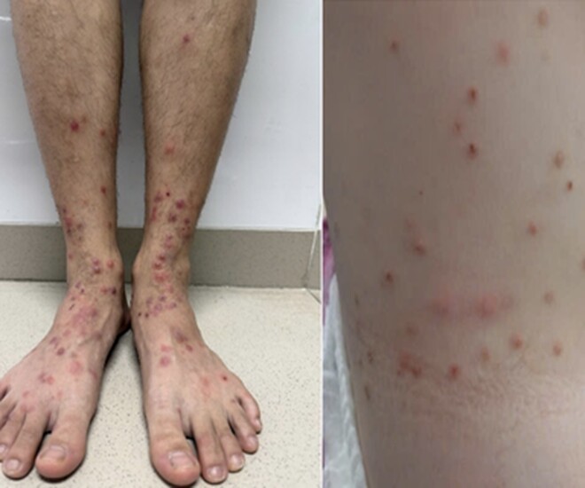 Bác sĩ Giang cho biết, không chỉ trẻ nhỏ mà ngay cả người trưởng thành cũng bị bọ chét tấn công. Điển hình như trường hợp nam thanh niên 20 tuổi, xuất hiện thương tổn sẩn đỏ, sẩn có mụn nước, ngứa nhiều ở tay, chân. Bệnh nhân tự điều trị bằng cách tắm lá, đắp lá nhưng thương tổn không giảm. Đồng thời xuất hiện thêm thương tổn mới, một số thương tổn có bọng nước trên nền sẩn đỏ.