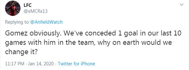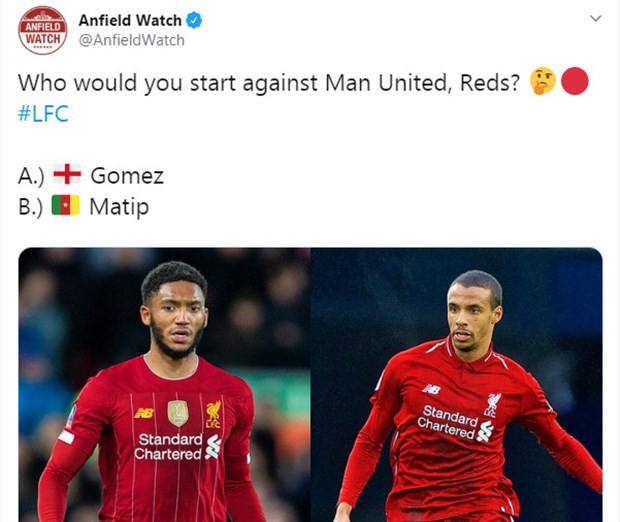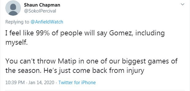 "Tôi có cảm giác 99% bình chọn sẽ dành cho Gomez, và trong đó có tôi. Không thể sử dụng Matip ngay trong trận đấu quan trọng nhất mùa, nhất là khi anh ấy chỉ vừa trở lại sau chấn thương."