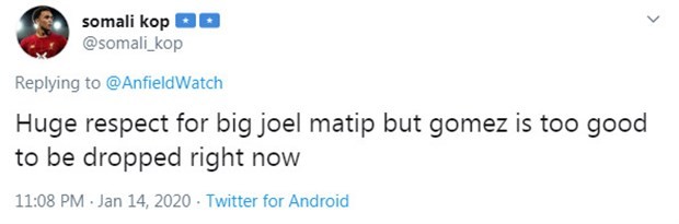"Với sự tôn trọng rất lớn dành cho Matip, nhưng Gomez quá tốt để bị loại vào thời điểm này."