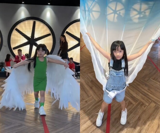 Đặc biệt, cặp song sinh Quinanna - Quinita còn học chung lớp catwalk với bé Destiny nhà Trường Giang và Nhã Phương. Là chị lớn và từng có kinh nghiệm biểu diễn, bé Destiny thể hiện những bước đi đầy thần thái. Đặc biệt hơn, cô bé còn tự tin biểu diễn với chiếc cánh cao gần 3m, catwalk đầy nhẹ nhàng và uyển chuyển.