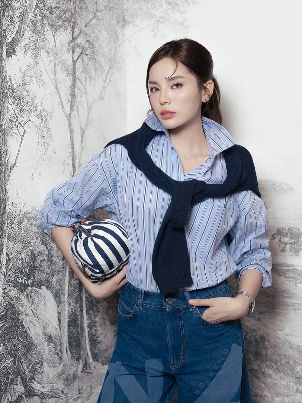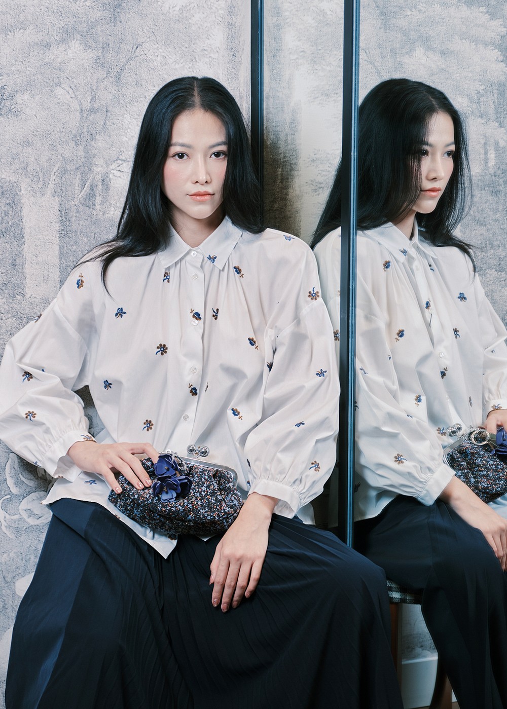 Hoa hậu Phương Khánh toát lên vẻ thanh lịch hiện đại trong thiết kế thuộc bộ sưu tập My Weekend Essentials với áo sơ mi Wkdbutterfly phối cùng chân váy Wkdfolk.